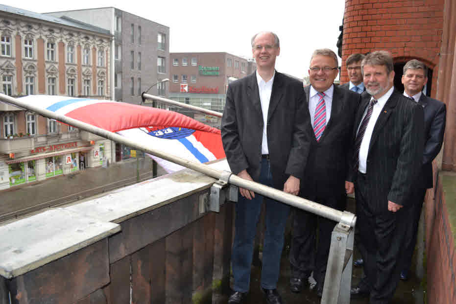 (Im Bild: Pankows Bezirksbürgermeister Matthias Kühne, Kolbergs Präsident Gromek und Alex Lubawinski mit Kolberger Fahne auf dem Balkon des Rathaus Pankow)
