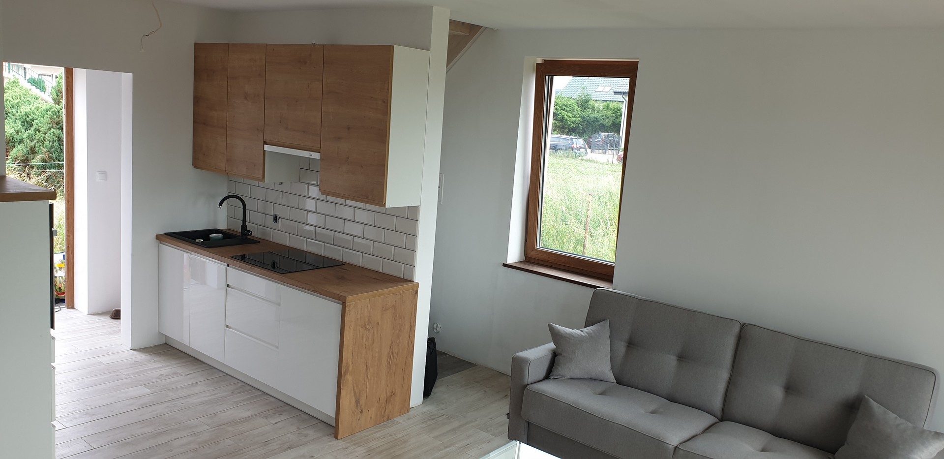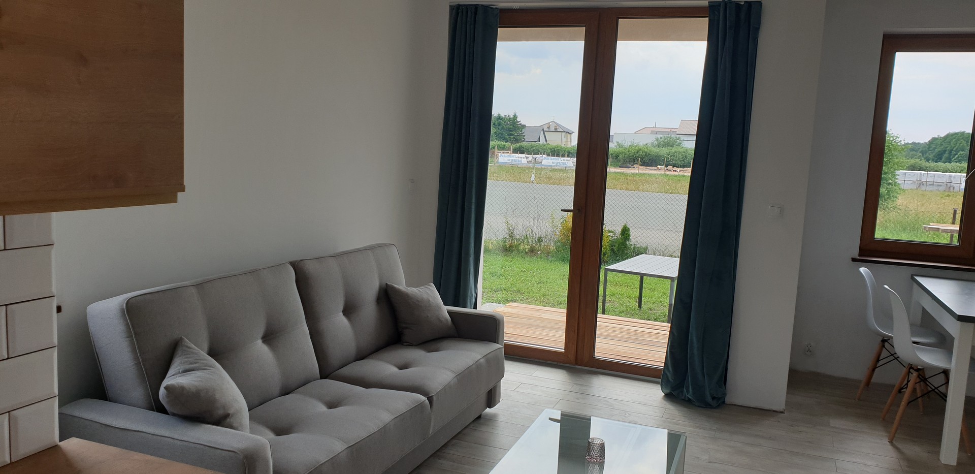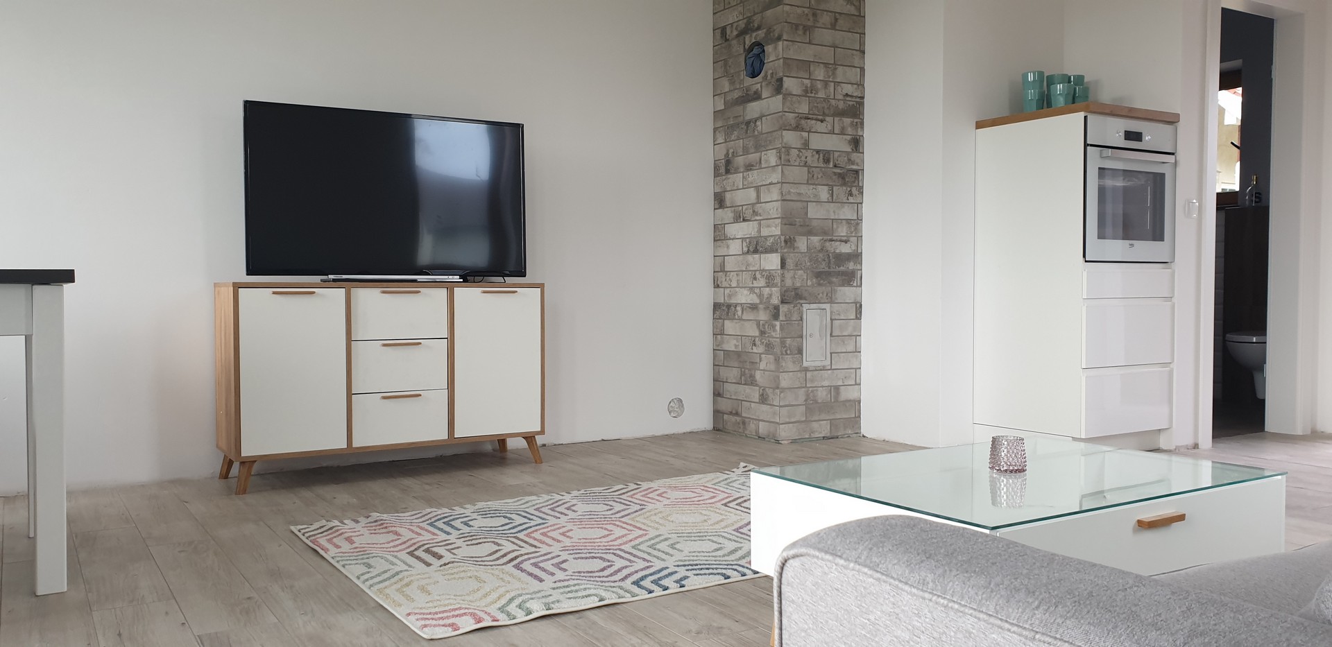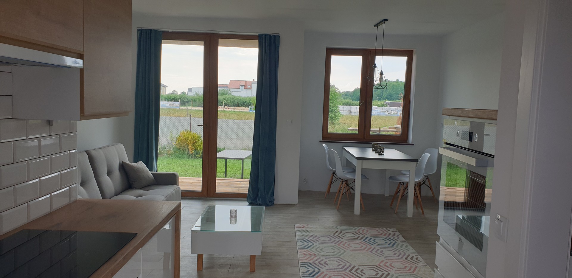 Im Erdgeschoss befindet sich der Wohnbereich mit einer Küche (inkl. Herd, Geschirrspüler), Esstisch, Couch